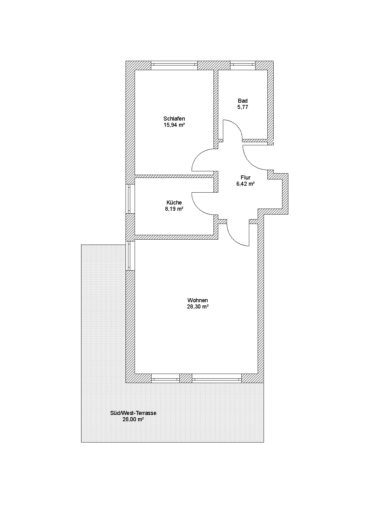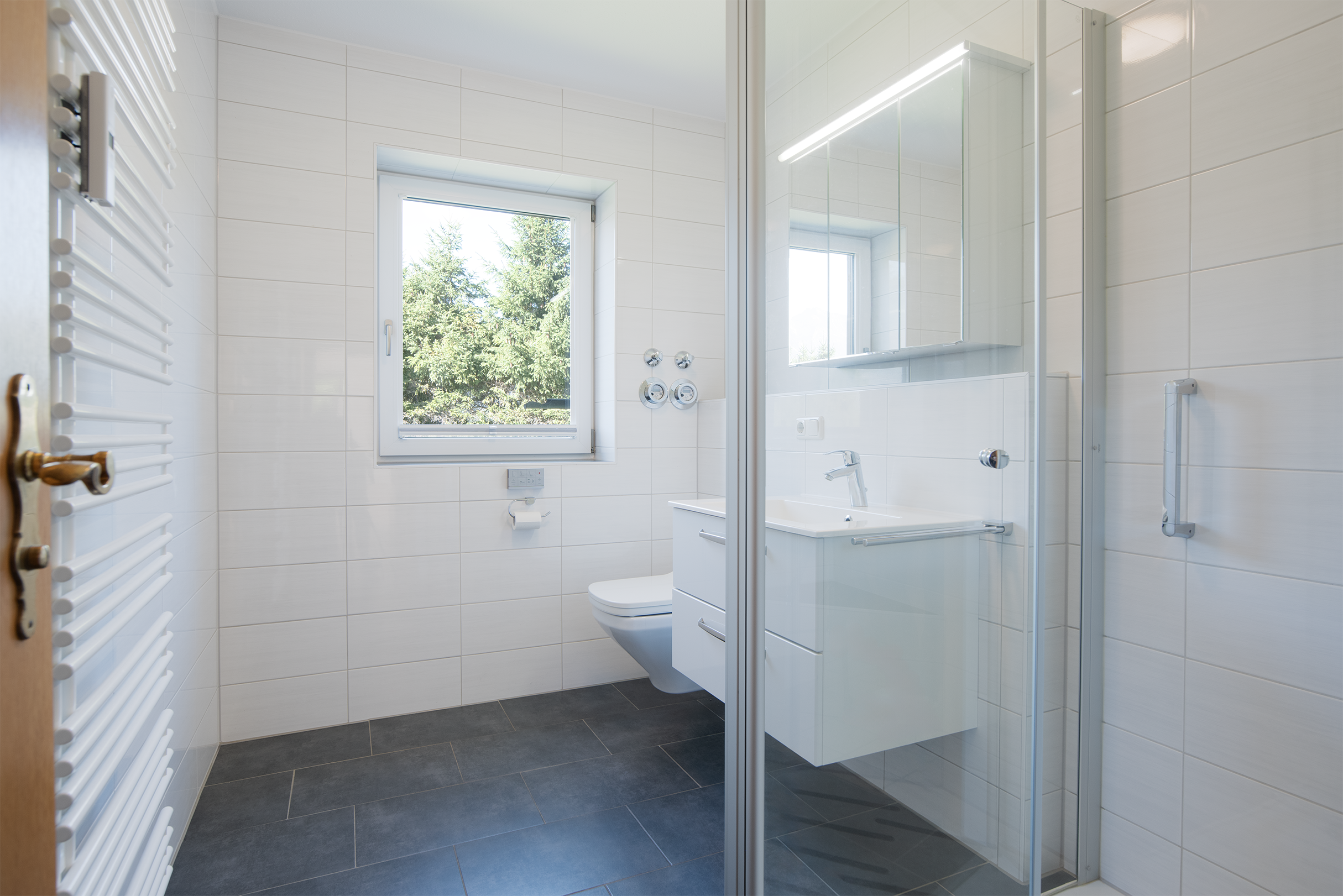 Der Eingangsbereich der Wohnung ist mittig angeordnet und sehr geräumig. Von hier aus haben Sie Zugang zum Badezimmer, zur kleinen separaten Wohnküche, zum großzügigen Schlafzimmer und dem Wohnzimmer mit mehr als 28 m², über welches Sie die herrliche Süd/West-Terrasse mit rund 28 m² sowie den Garten erreichen. Des Weiteren gehört zur Wohnung ein abgeschlossener Kellerraum mit etwa 18 m². Ebenso befindet sich im Haus ein großer gemeinschaftlicher Wasch- und Trockenraum, in dem jeder Eigentümer seine eigene Waschmaschine und Trockner nutzt.