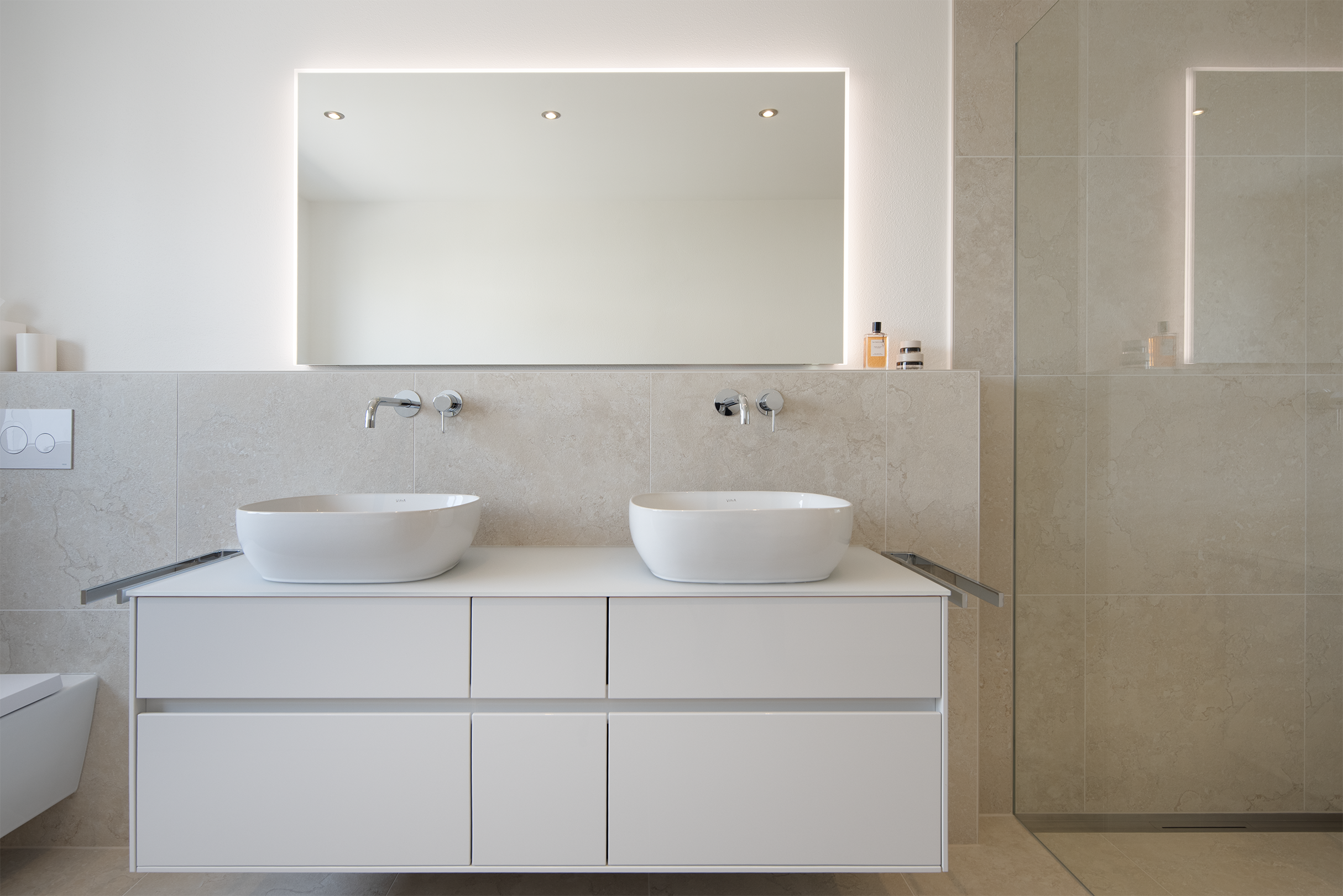 Das Objekt ist sehr luxuriös ausgestattet. Italienisches Feinsteinzeug des Herstellers Ceramiche Coem zieht sich durch das gesamte Erdgeschoss und die Sanitärräume des Hauses. Die Wohnräume im Ober- und Dachgeschoss sowie die Gästewohnung und auch der Fitnessraum überzeugen dagegen mit einem hochwertigen österreichischen Dielenparkett in gebürsteter und geölter Eiche. Das Wohlfühlbad im Obergeschoss und auch das Duschbad der Gästewohnung sind mit Burgbad-Waschtischunterschränken und Spiegel bereits vollständig möbliert . Des Weiteren ist das Objekt mit Einbau-Strahlern in den Fluren, der Küche, dem Wohnbereich, dem Studio und den Bädern sowie modernen Gipslampen in den übrigen Räumen ausgerüstet. Für einen erhöhten Schallschutz sorgen zusätzlich Vollspantüren mit stylischen Flachrosetten.