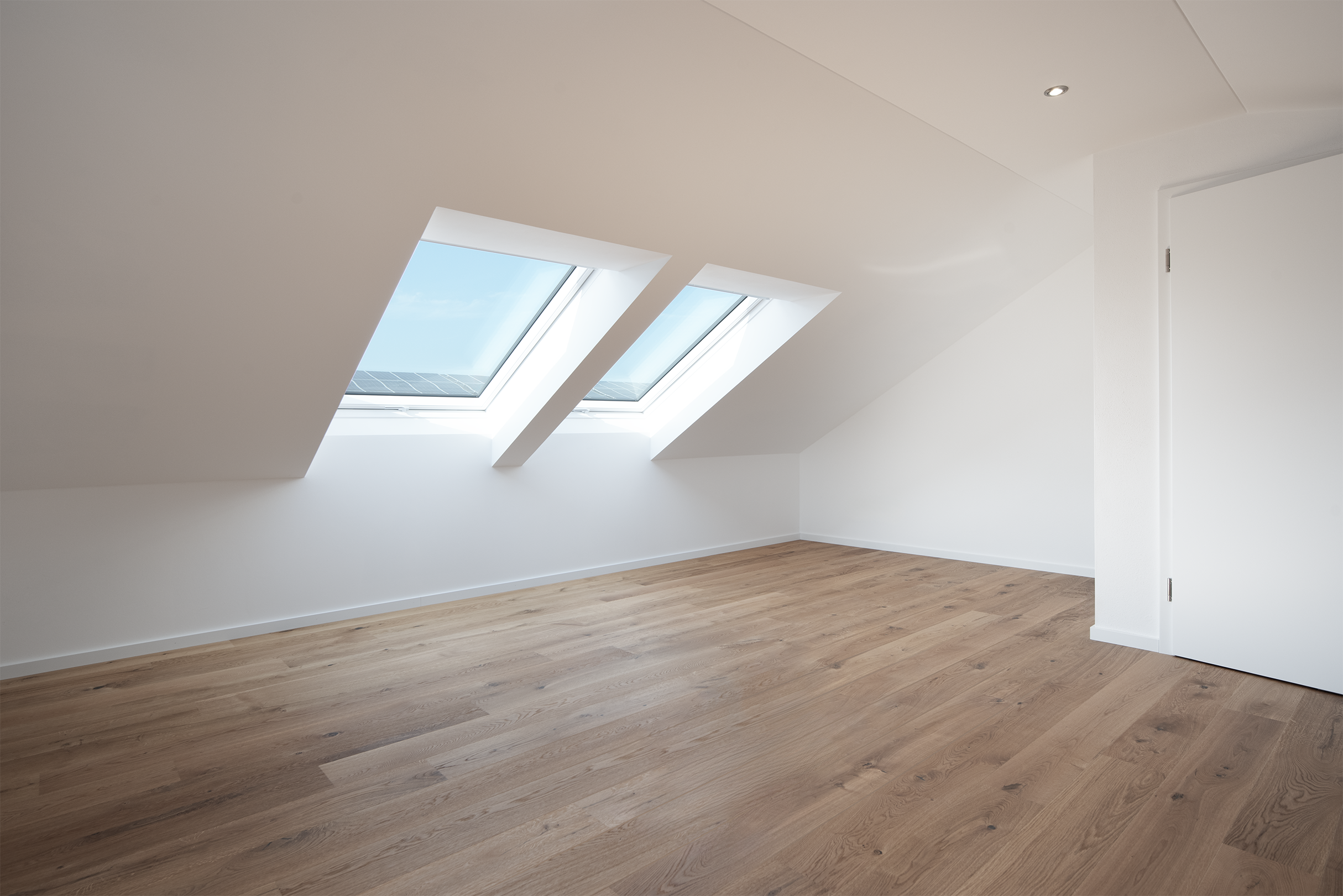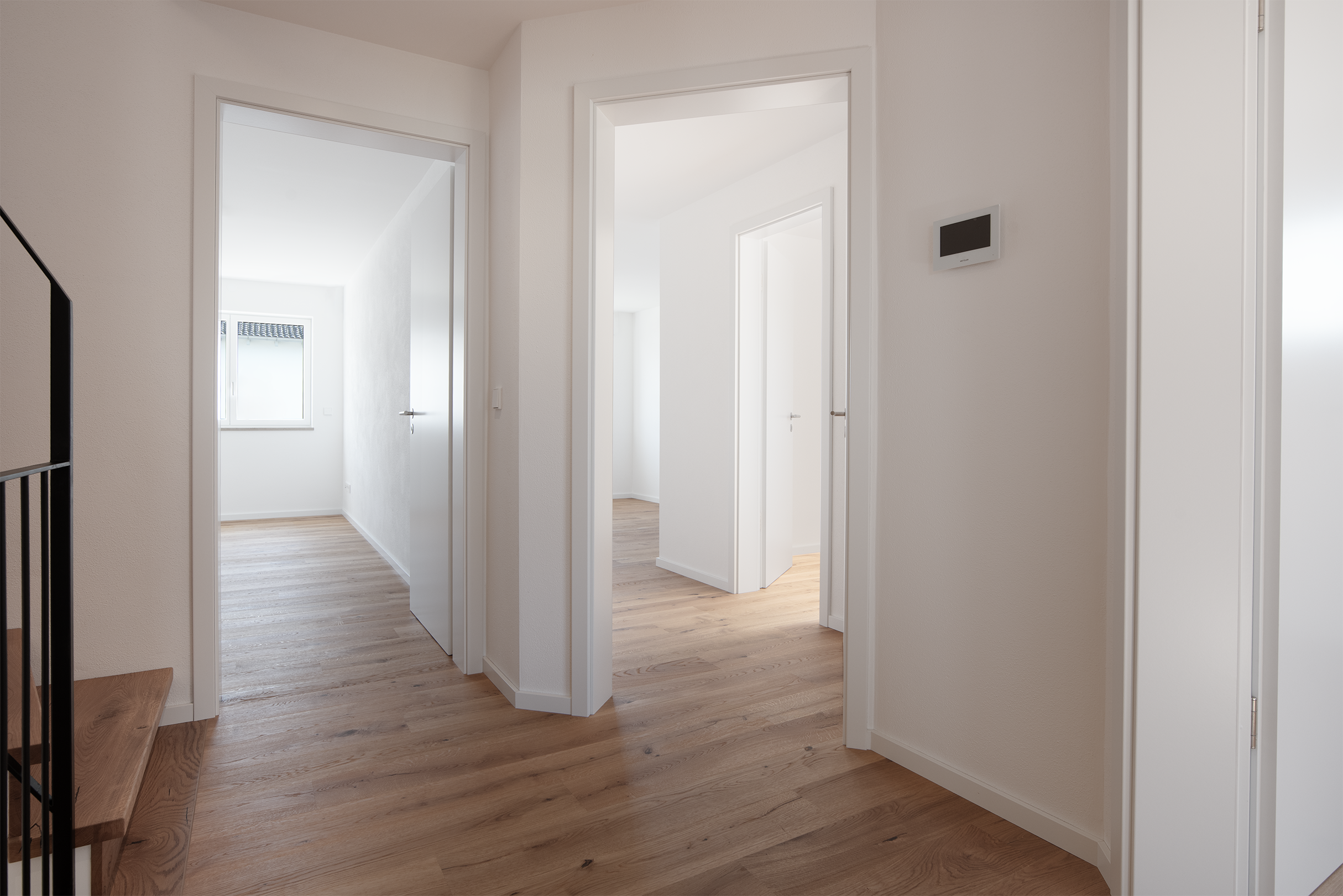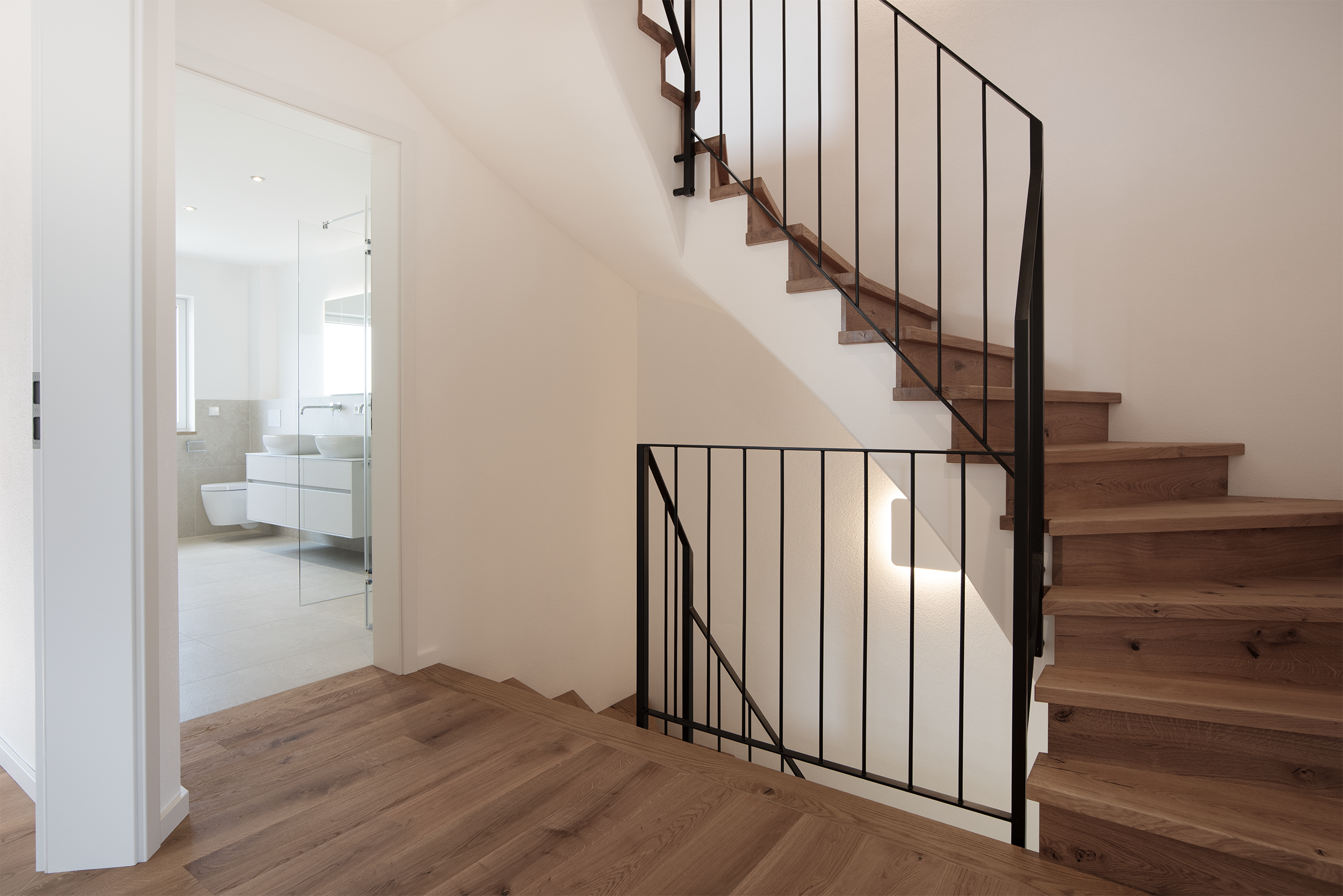 Über einen Windfang erreicht man zum einen den großzügig konzipierten Empfangsbereich des Hauses und zum anderen eine etwa 33 qm große Gästewohnung mit eigenem kleinem Duschbad. Die Gästewohnung ist hell und freundlich gestaltet und erstreckt sich über 2 Etagen, welche durch eine innenliegende Treppe verbunden sind. Der Empfangsbereich des Hauses bietet Platz für eine großzügige Garderobe und führt uns direkt in den lichtdurchfluteten Koch-, Ess- und Wohnbereich mit einer riesigen Hebe-Schiebe-Tür sowie zu einem separatem Gäste-WC und einem kleinen Abstellraum. Über die halb gewendelte Treppe mit Massivholzstufen aus gebürsteter Eiche und filigranem schwarzen Eisenstäben erreicht man das Obergeschoss, was sich in drei helle Räume, einem Badezimmer mit Fenster und einem Ankleidezimmer gliedert. Die Räume sind wahlweise als Schlaf- oder Kinderzimmer oder als Büro nutzbar. Das Badezimmer hat eine warme Atmosphäre und ist mit einer halb freistehenden Badewanne, einer großzügigen Echtglas-Dusche sowie zwei Waschtischen und einem WC ausgestattet. Ein absoluter Wohntraum ist das geräumige Studio im Dachgeschoss mit viel Tageslicht und einem Weitblick bis über die Felder der Umgebung. Aber auch im Untergeschoss hört der Luxus nicht auf. Neben dem Schlafbereich der Gästewohnung finden wir hier auch einen rund 23 qm großen Fitnessraum. Auch diese beiden Räume verfügen über viel Tageslicht, welches durch große Lichthöfe mit begehbaren Glasabdeckungen sichergestellt ist.