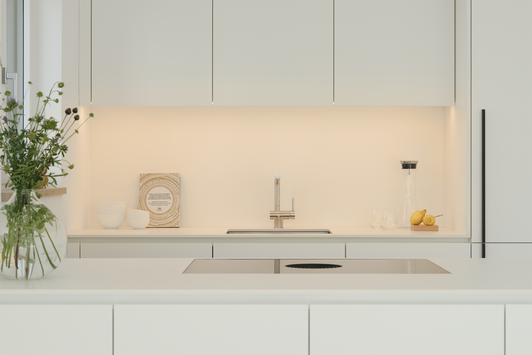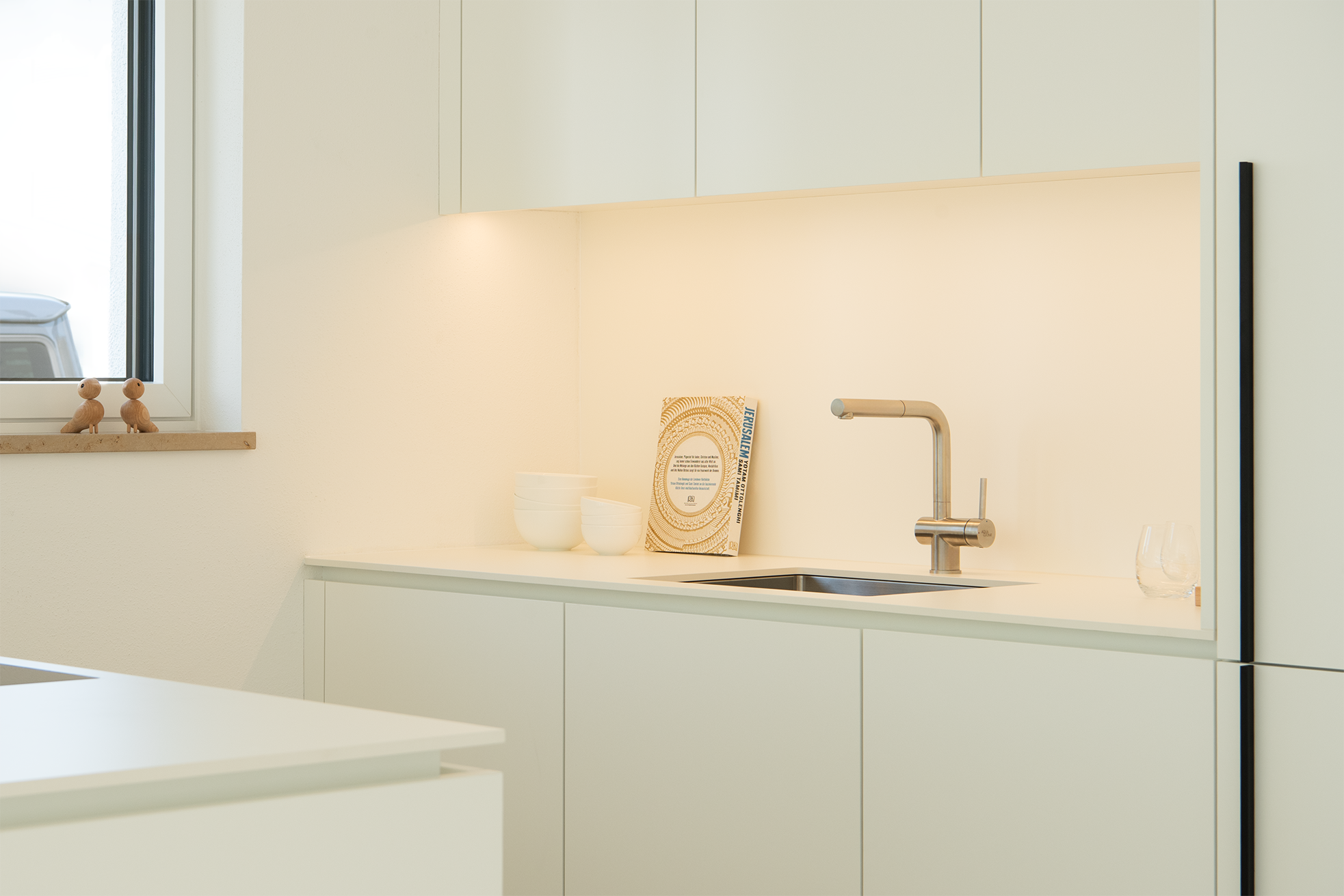 Des Weiteren ist im Kaufpreis auch eine von uns geplante Luxus-Schreinerküche enthalten. Die moderne Küche zeigt sich mit eleganten weißen Oberflächen und ist mit einem großzügigen Kühlschrank, einem Backherd und einer Spülmaschine der Marke Miele, sowie einem Induktionskochfeld mit integriertem Dunstabzug des Marktführers BORA ausgestattet. Die Schreinerküche besticht durch die durchdachte Funktionalität und hervorragende Raumnutzung. So entstehen durch innenliegende Massivholzschubläden aus Eiche keine ungenützten Räume und auch der Küchenblock mit den vorgelagerten Schränken bietet einen perfekten Stauraum für sämtliches Geschirr für den unmittelbar davorstehenden Esstisch.