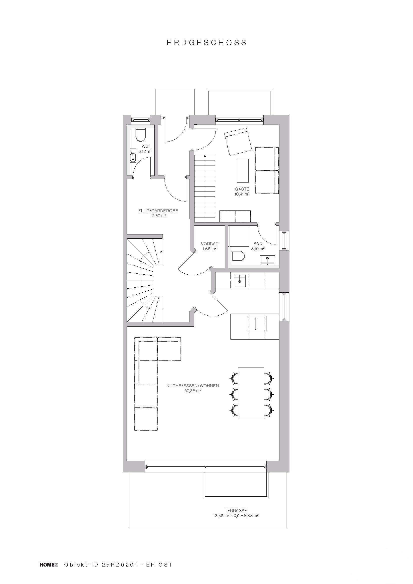 Bei dieser stilvollen Immobilie handelt es sich um einen in Massivbauweise erstellten Neubau von HOMEZ, der sich über vier Etagen erstreckt. Wir haben ein wunderschönes Reihenhaus mit viel Aufmerksamkeit für Details, Licht und Atmosphäre geschaffen. Die Formen und Materialien der Inneneinrichtung strahlen Ruhe und Schlichtheit aus und vereinen Funktionalität mit klaren Linien.