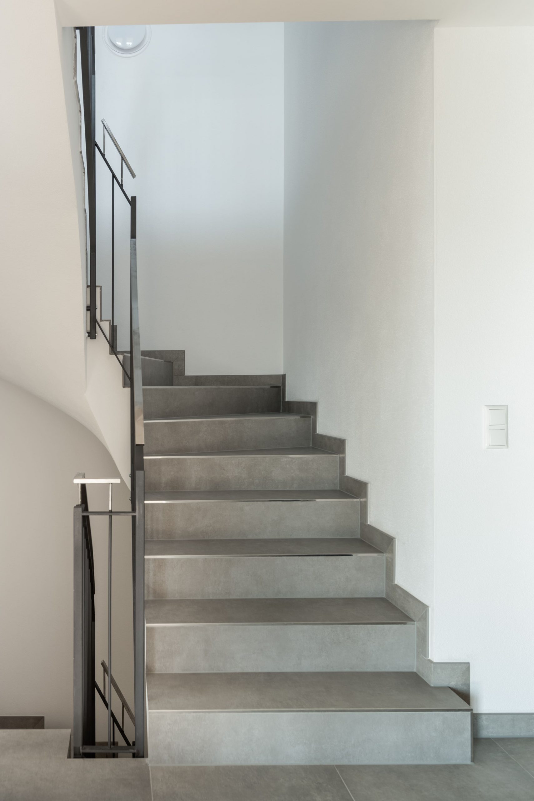 Der Empfangsbereich ist sehr großzügig konzipiert und bietet Zugang zum lichtdurchfluteten Koch- und Wohnbereich sowie zu einem Gäste-WC und einem Abstellraum. Der Kochbereich ist bereits mit einer hochwertigen Schreinerküche in zeitlosem modernen Weiß ausgestattet. Über die Treppe mit filigranem schwarzen Stahlgeländer erreicht man das Obergeschoss, was sich in drei helle Räume und einem Badezimmer mit Fenster gliedert. Die Räume sind wahlweise als Schlaf- oder Kinderzimmer oder als Büro nutzbar. Das Badezimmer hat eine warme Atmosphäre und ist mit einer Badewanne, einer großen Regendusche sowie zwei Waschtischen und einem WC ausgestattet.