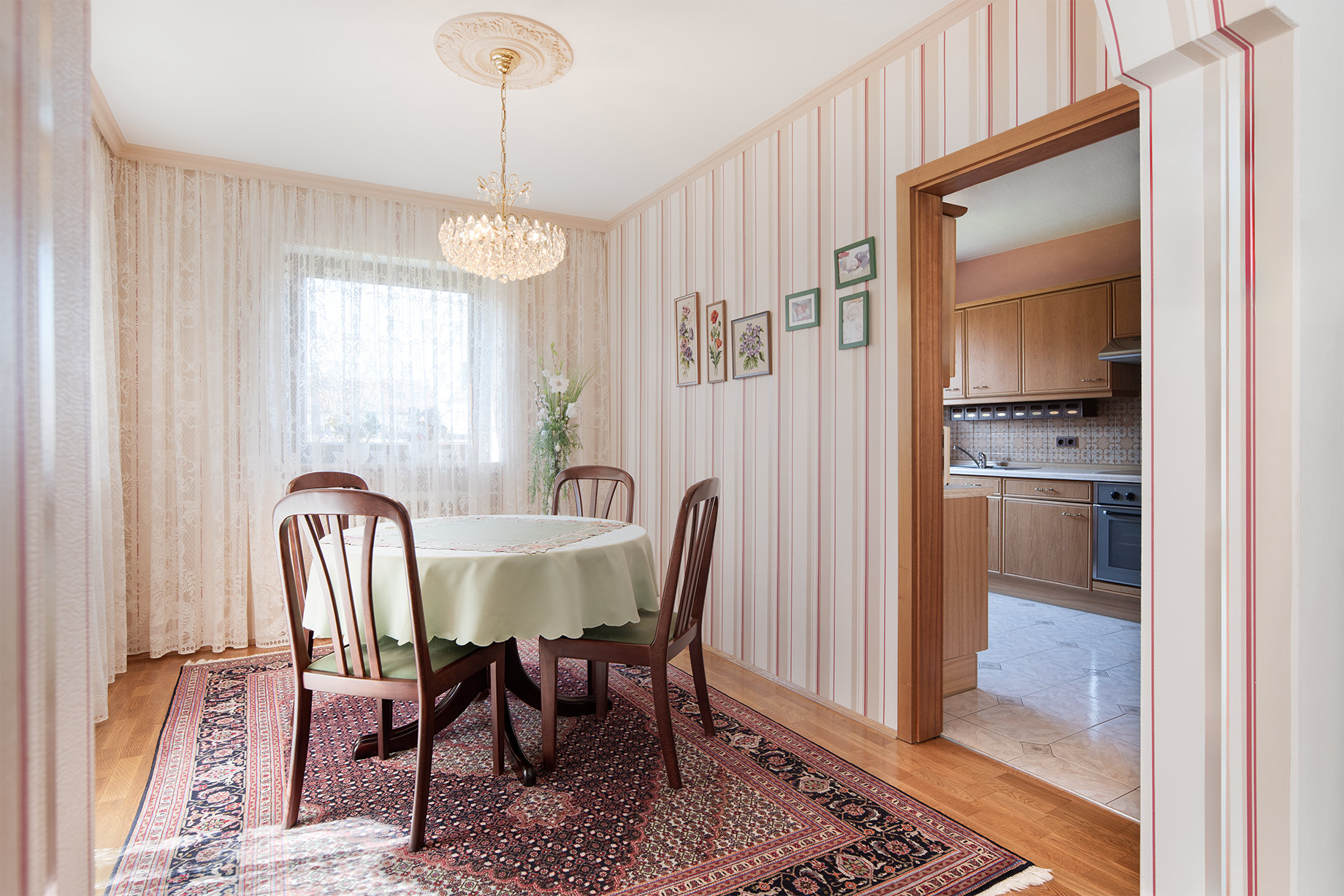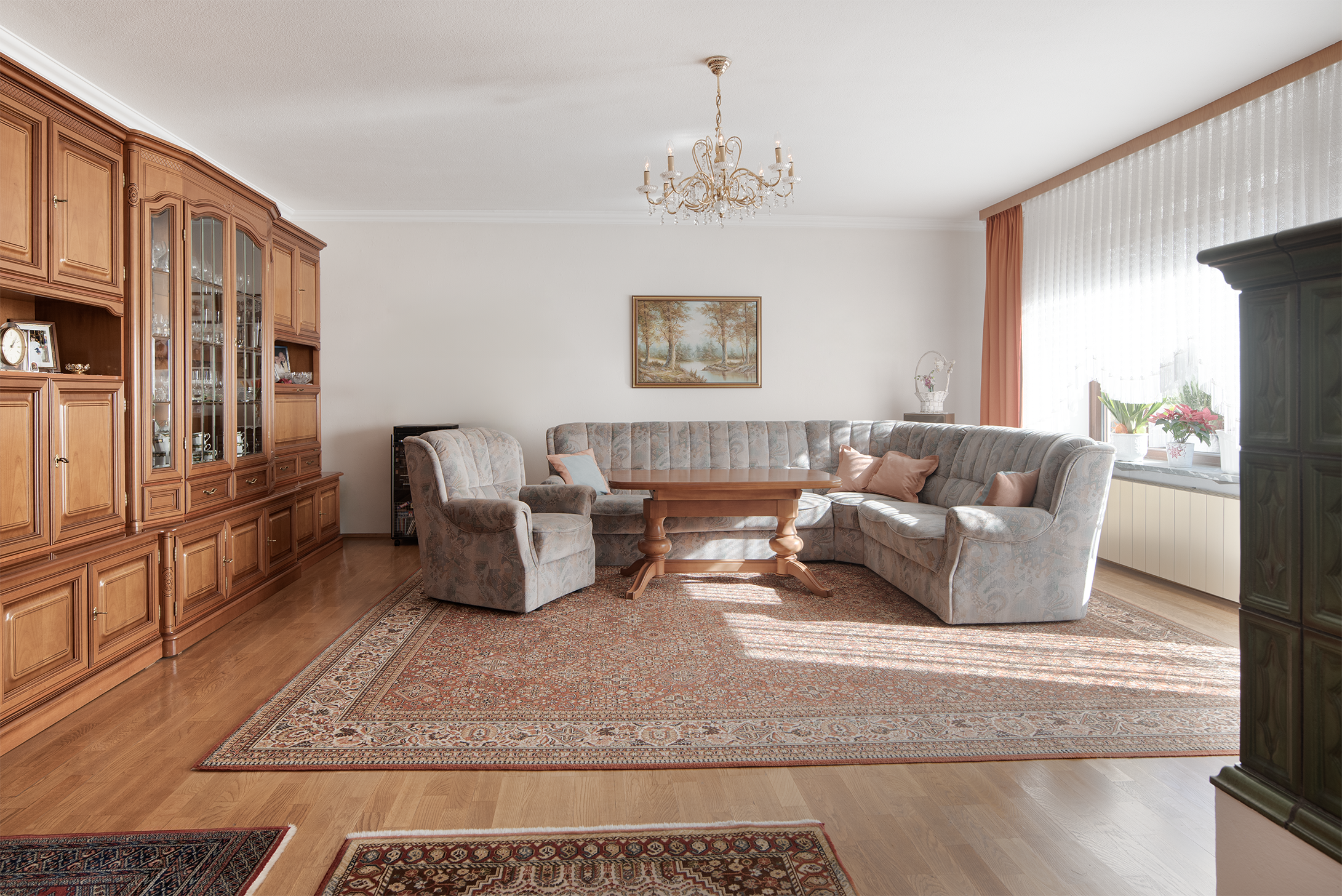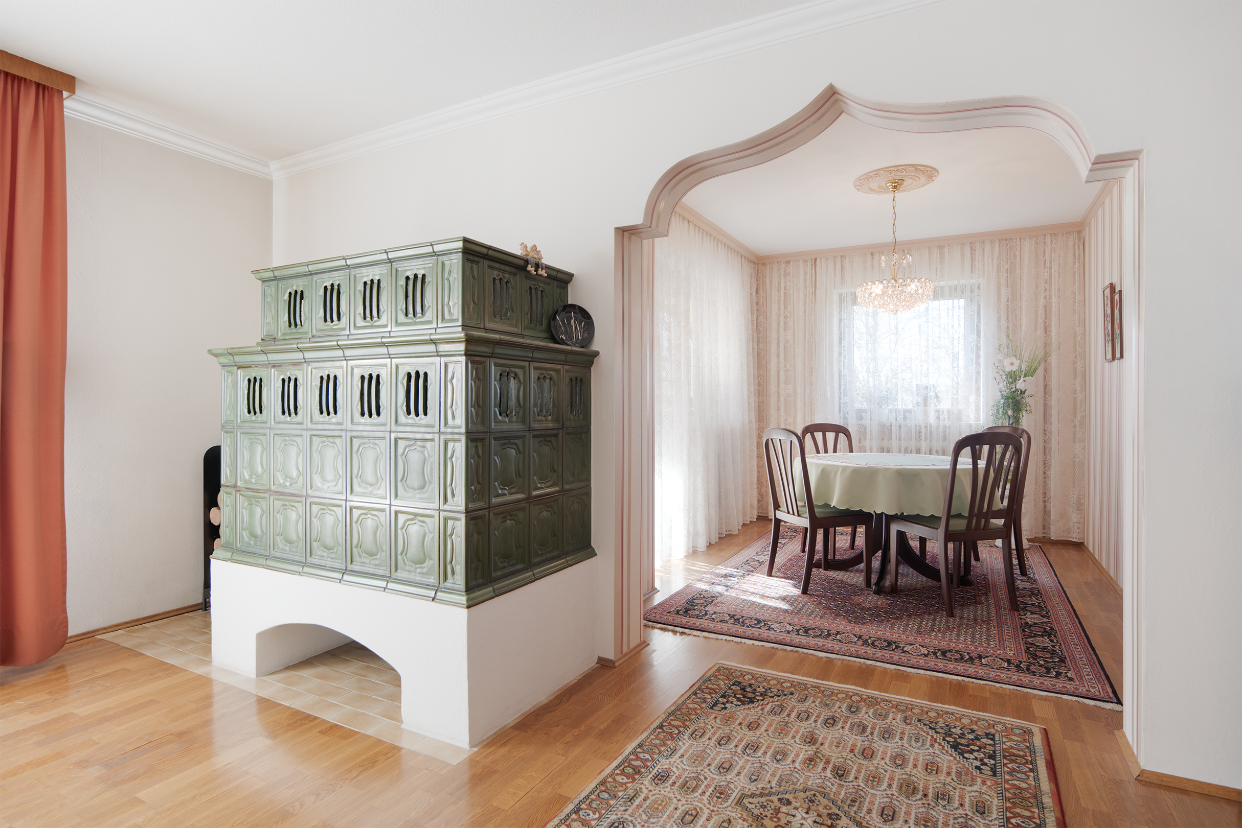 Über die windgeschützte Außentreppe erreichen wir die Haustüre, welche in einen Windfang mit geräumiger Garderobe führt. Von hier haben wir Zugang zum Gäste-WC und zur Vorratskammer, sowie durch einen offenen Rundbogen zur herrschaftlichen Diele mit Treppenaufgang des Hauses. Das angrenzende Wohnzimmer erstreckt sich auf 32 m² Wohnfläche und beherbergt einen kuschligen Kachelofen, der an kalten Tagen für wohlige Wärme und Behaglichkeit sorgt. Ein weiteres Highlight des Wohnzimmers sind die großen, nach Süden ausgerichteten Fensterflächen, welche für viel Licht und Atmosphäre sorgen und gleichzeitig einen Zugang zur Süd-Terrasse bieten. Das separate Esszimmer mit weiteren rund 9 m² ist lediglich durch einen Segmentbogen vom Wohnzimmer getrennt und bietet über einen gedeckten Außenbereich einen Zugang zur Terrasse und zum Garten. Die abgetrennte Küche ist von der Diele und über das Esszimmer zugänglich und bietet ein großzügiges Kochparadies, welches auch bei mehreren Gästen genügend Raum für die Vorbereitung der kulinarischen Köstlichkeiten bietet. Ein zusätzliches Arbeitszimmer ergänzt das Raumangebot im Erdgeschoss auf harmonische Weise und schafft einen angenehmen Rückzugsort für Homeoffice oder kreative Tätigkeiten.